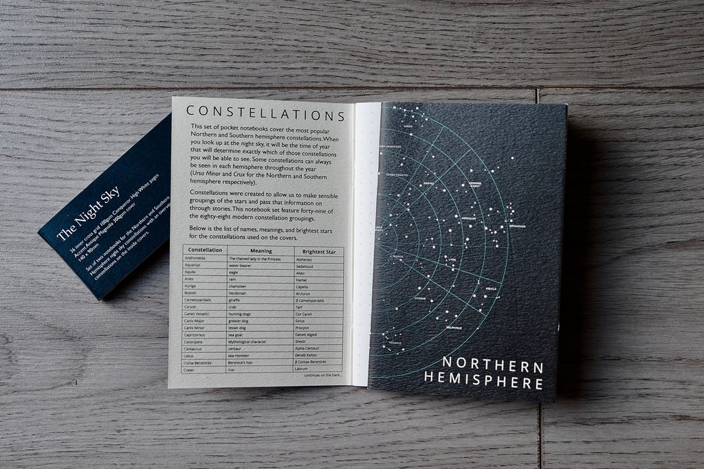 This set of pocket notebooks cover the most popular Northern and Southern hemisphere constellations. When you look up at the night sky, it will be the time of year that will determine exactly which of those constellations you will be able to see. Some constellations can always be seen in each hemisphere throughout the year (Ursa Minor and Crux for the Northern and Southern hemisphere respectively).